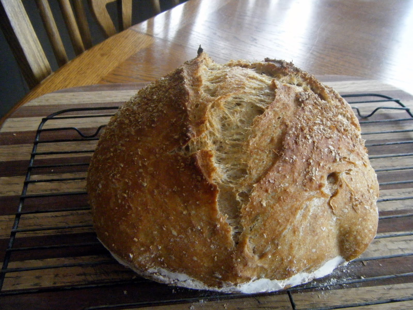 Looking online I found the widely disseminated Jim Lahey recipe and followed it pretty close. There are numerous discussions and websites on the topic of this simple bread. It does make a perfect loaf with very little effort. I've been using a whole wheat variation by substituting one of the 3 cups of flour with whole wheat. This is great slicing bread and is as beautiful to look at as it is tasty to eat. I haven't tried cooking it outdoors with coals as my heat source yet but will get there I'm sure.